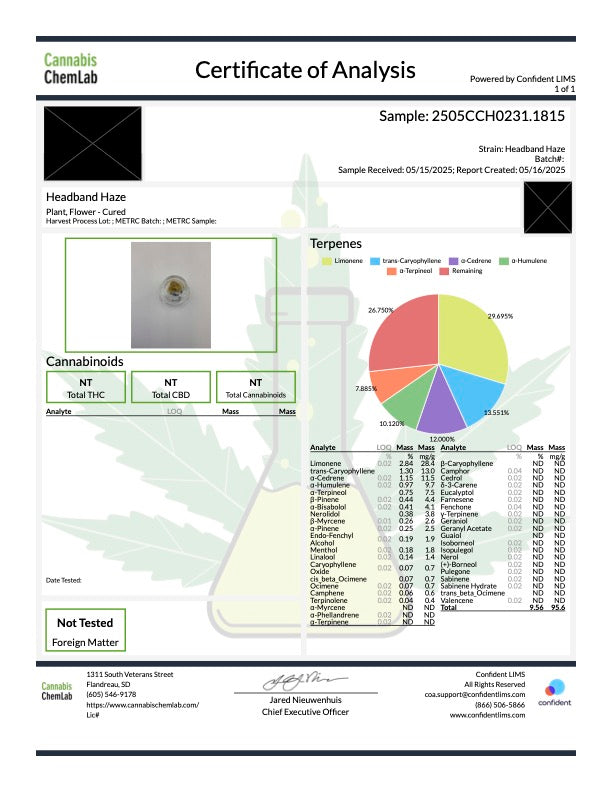 Headband Haze Cold Cure Live Rosin blends zesty lemon and herbal pine flavors with a subtle diesel bite. The aroma is bright and tangy, with a hazy, incense-like finish. Its effects are mentally uplifting and clear, gradually melting into a soothing headband-like pressure and calm body buzz. Headband Haze Cold Cure Live Rosin tests high in Limonene, Caryophyllene, and Cedrene.