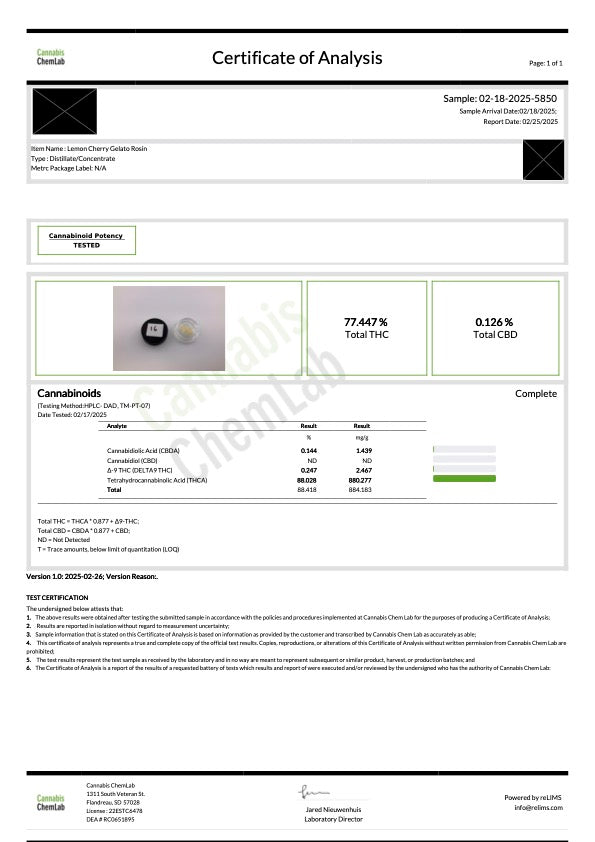 Nick's Nugs Lemon Cherry Gelato Cold Cure Live Rosin (88.028% THCa)