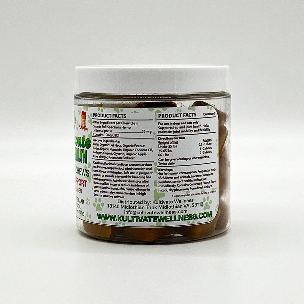 Kultivate Wellness' CBD Soft Chews are carefully crafted with organic, natural ingredients to support your pet’s joint health and overall well-being. Featuring organic full spectrum hemp oil and collagen, these chews promote an active lifestyle for pets and help aging furry friends. Free from artificial additives or preservatives, they’re a gentle, wholesome chew your pet will love. The irresistible peanut butter flavor makes it simple to incorporate CBD into your pet’s daily routine, ensuring happier tummies and healthier days.