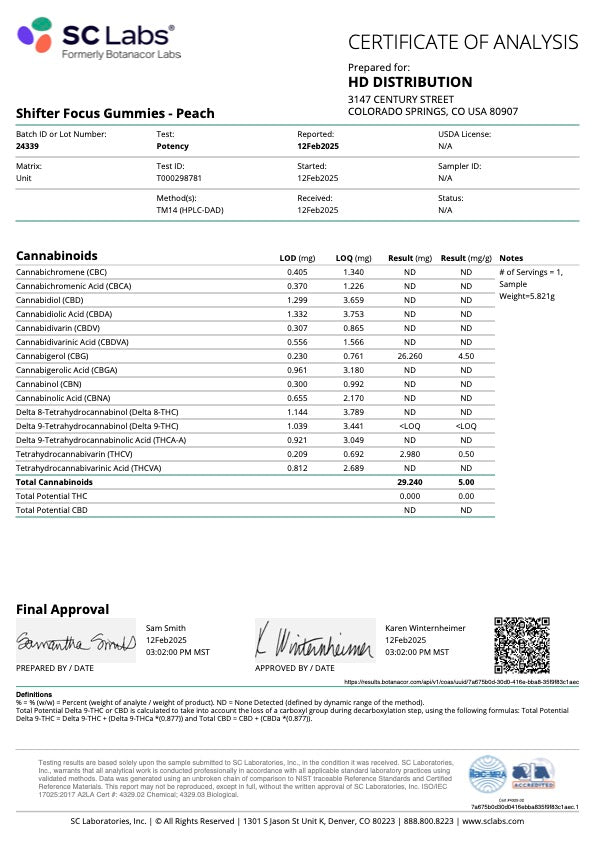 Shifters™ Focus Gummies are a microdose blend of THCv and Delta-9 THC with CBG, Magnesium L-Threonate and Dr. formulated Terpenes blend for energy. Flavors include a mix of Pineapple, Pear and Peach.